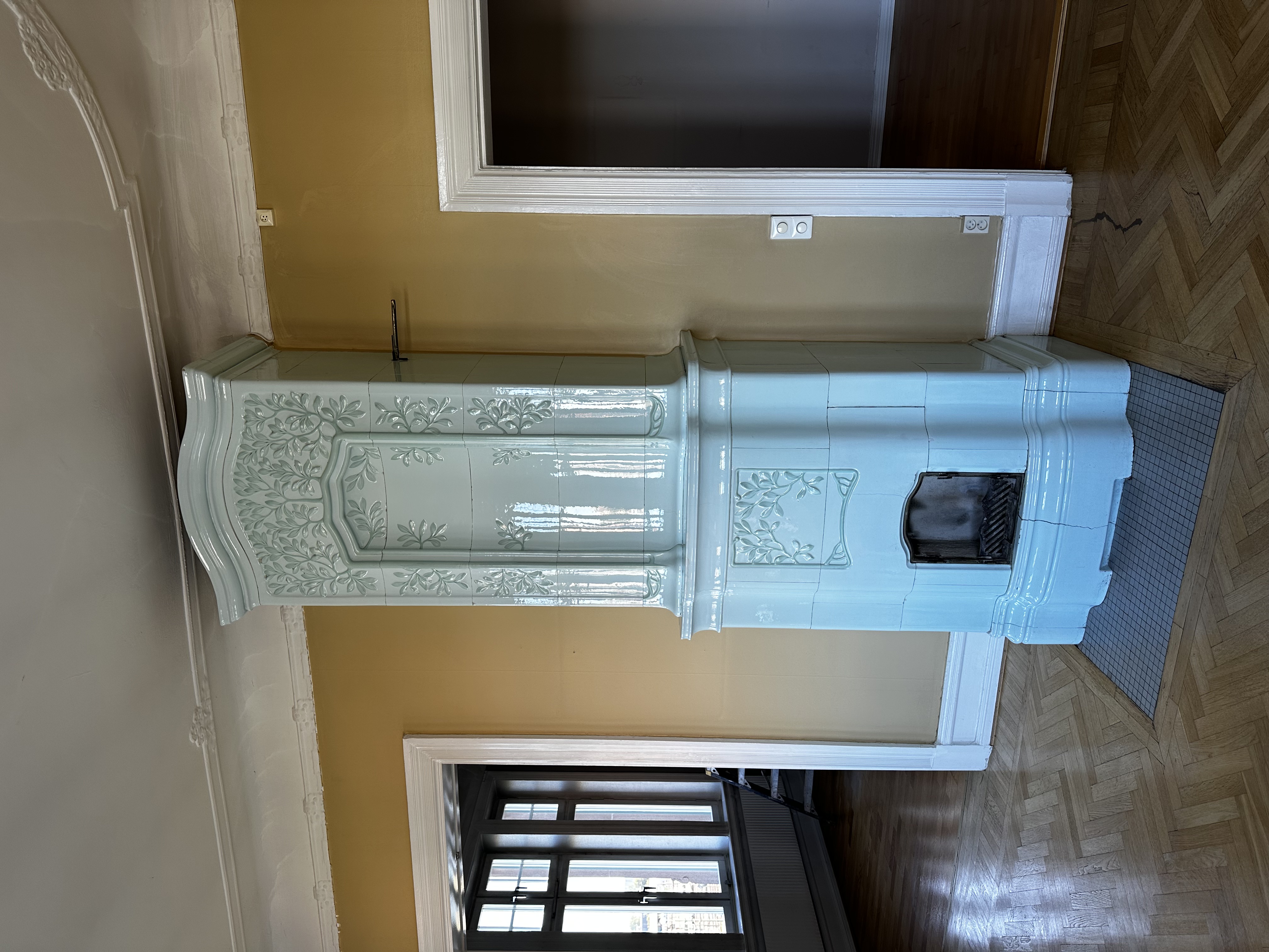 En fantastiskt vacker jugend kakelugn för planvägg. Höjd ca 3,23m