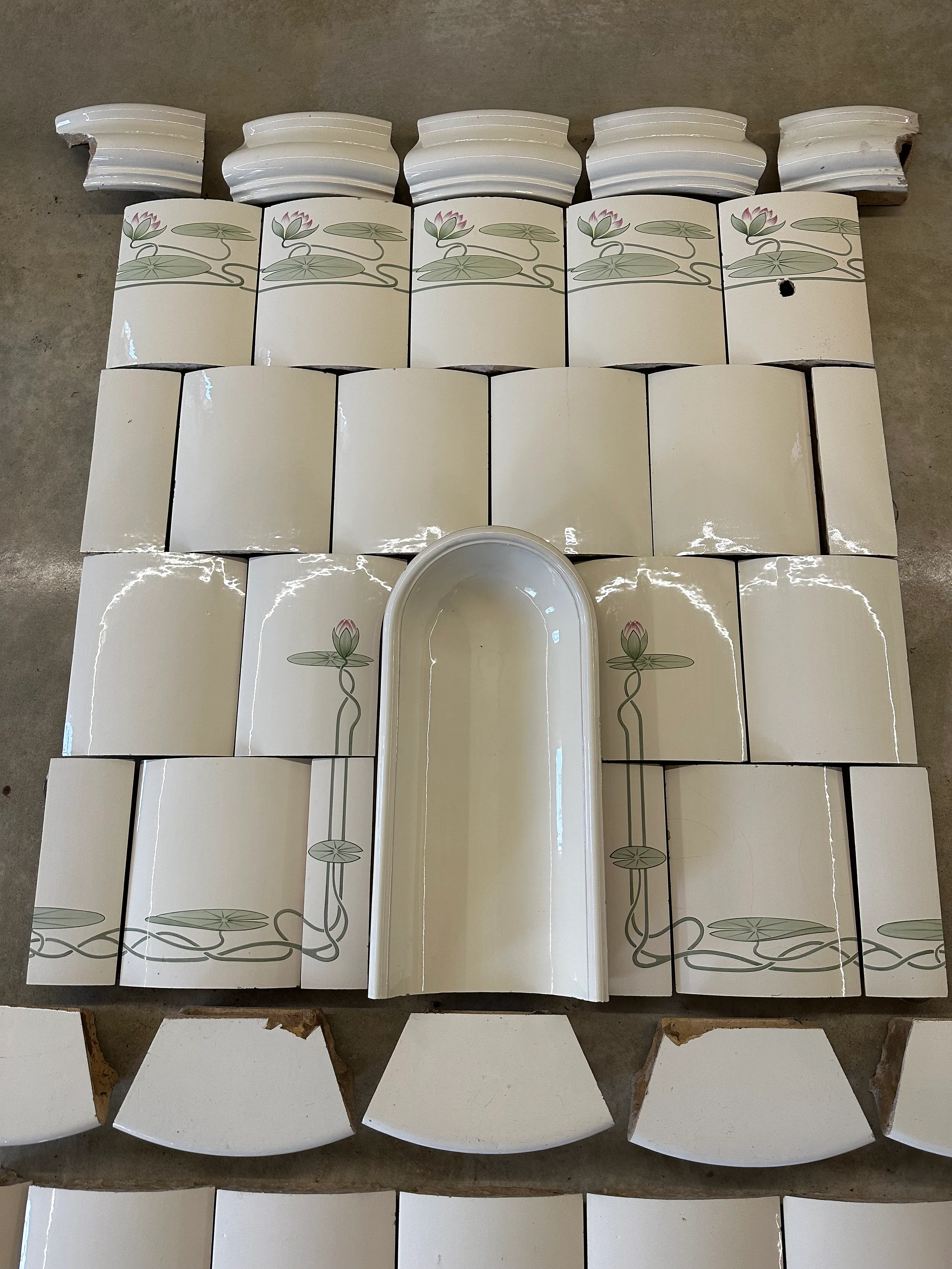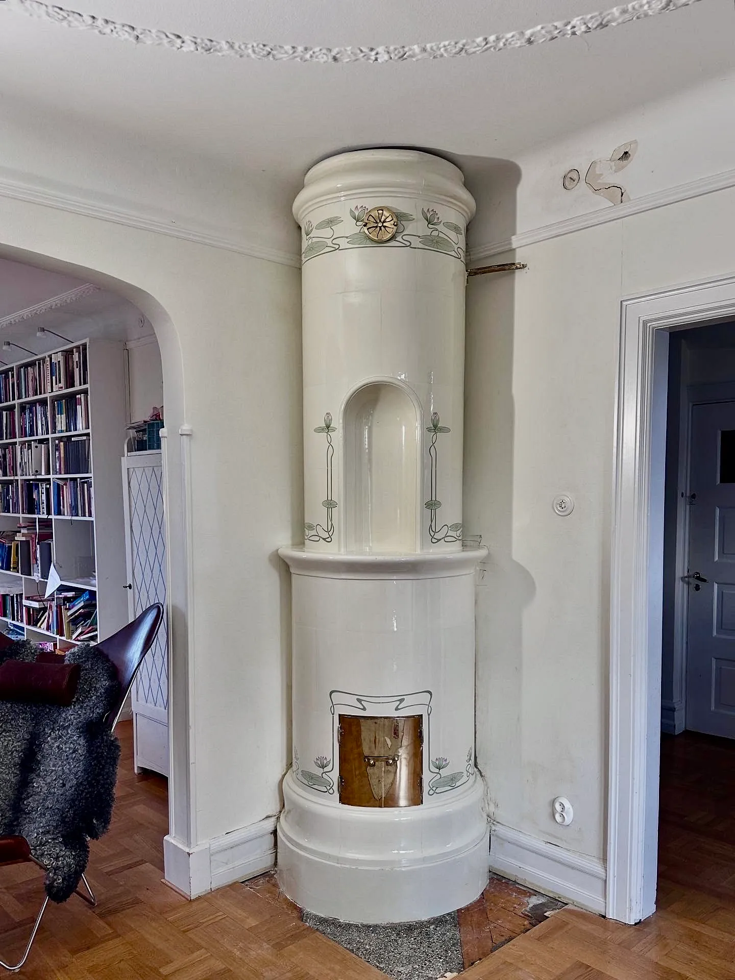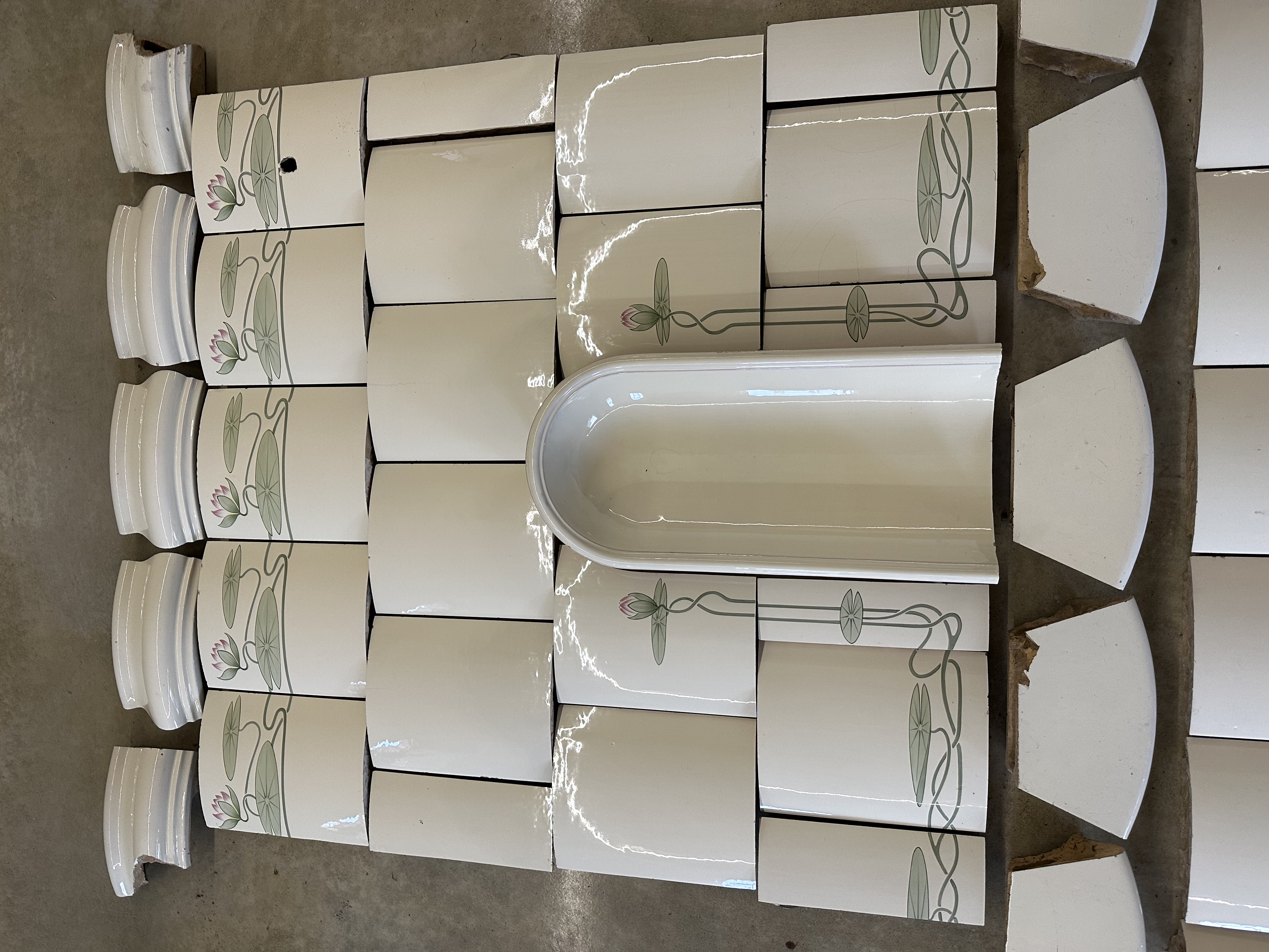 En mycket vacker kakelugn i krämfärgade kakel som är dekorerad med näckrosor