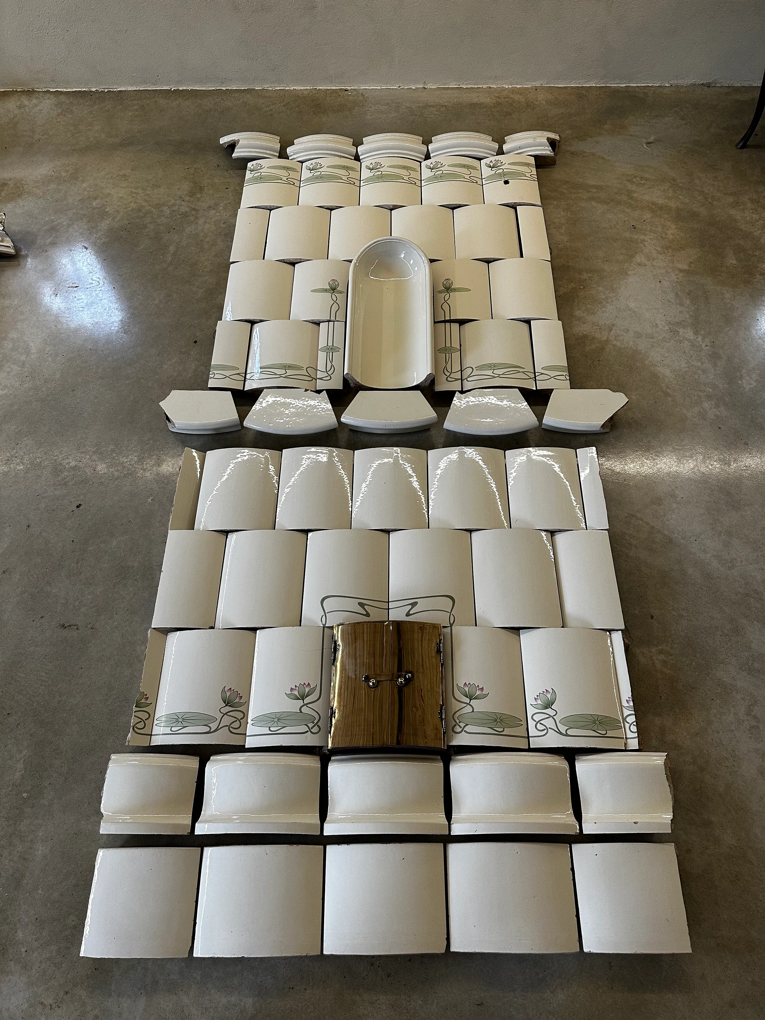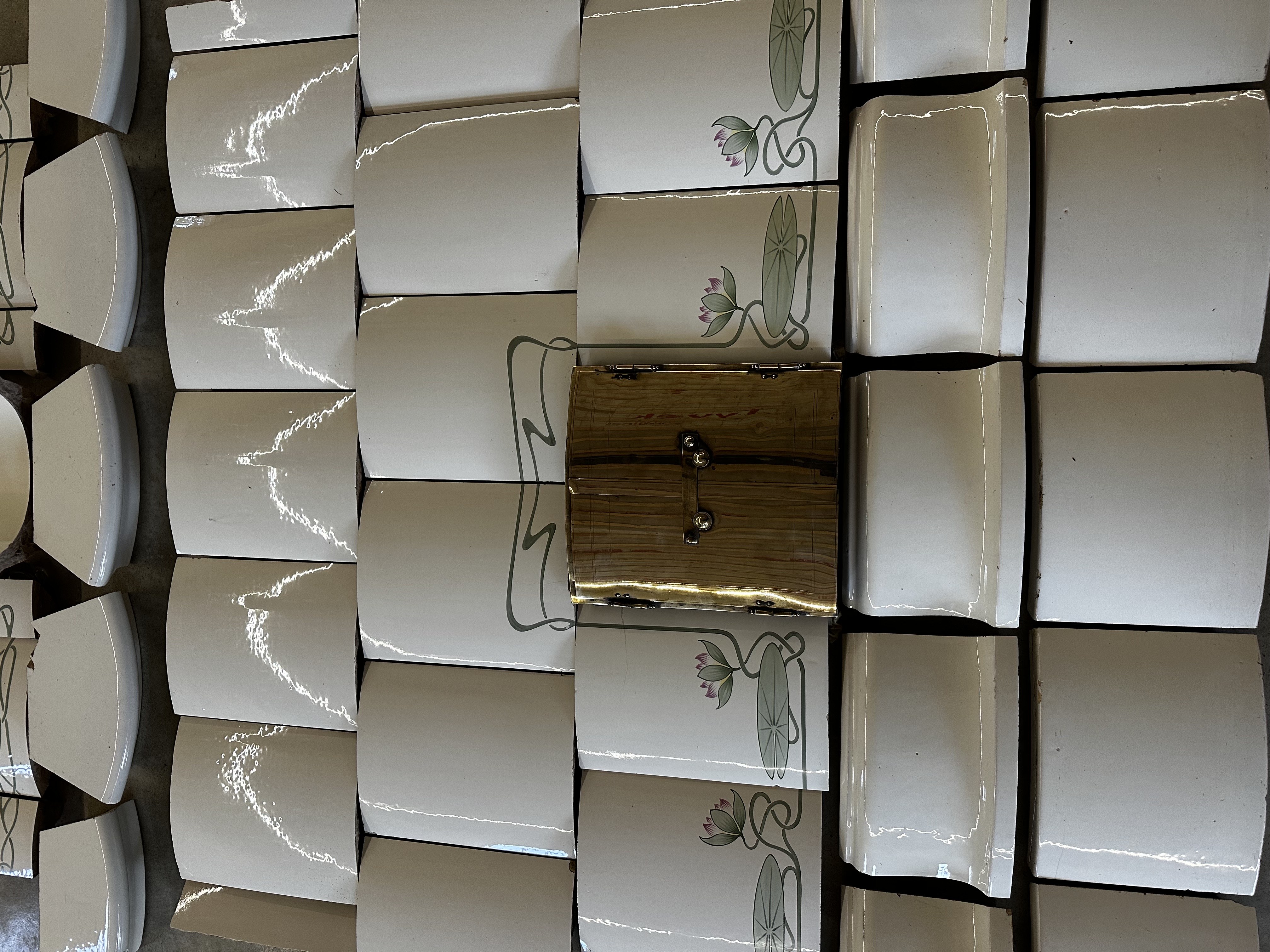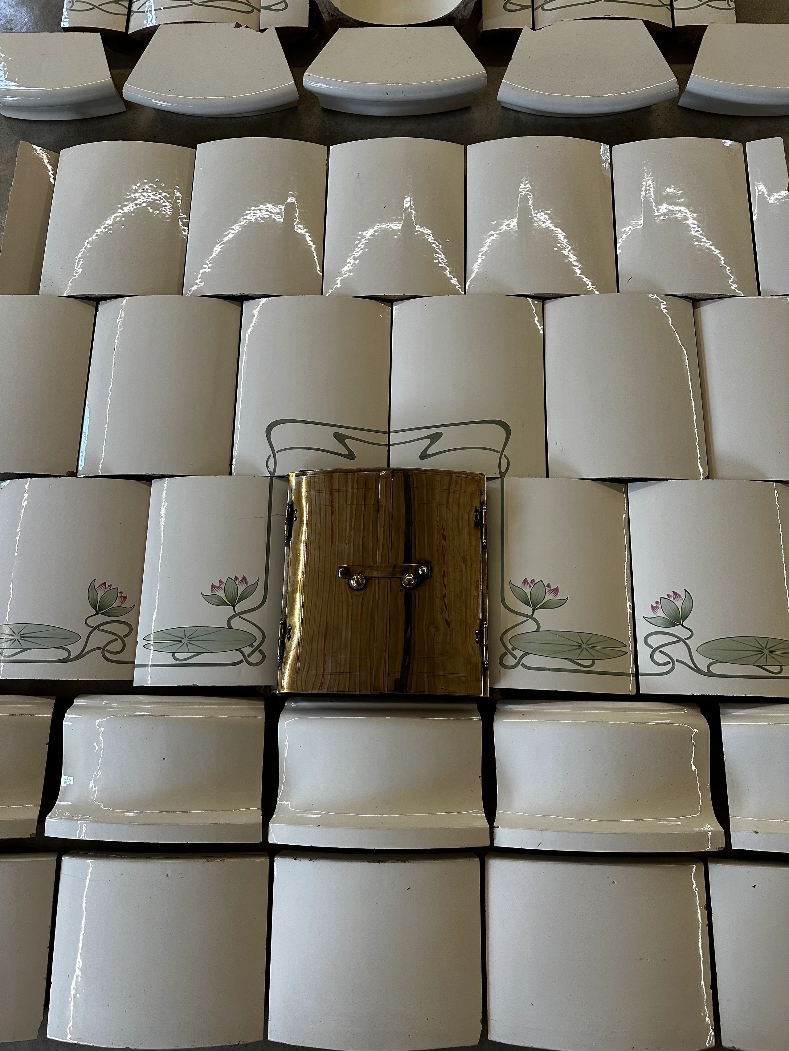 En mycket vacker kakelugn i krämfärgade kakel som är dekorerad med näckrosor